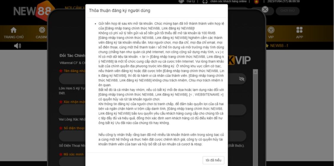 Bước cuối cùng trong quá trình đăng ký NEW88, yêu cầu người mới đọc kỹ thoả thuận về điều khoản và chính sách quy định. Tích vào ô “Tôi đã hiểu…” đồng nghĩa với việc chấp thuận thực hiện mọi yêu cầu của điểm cược.