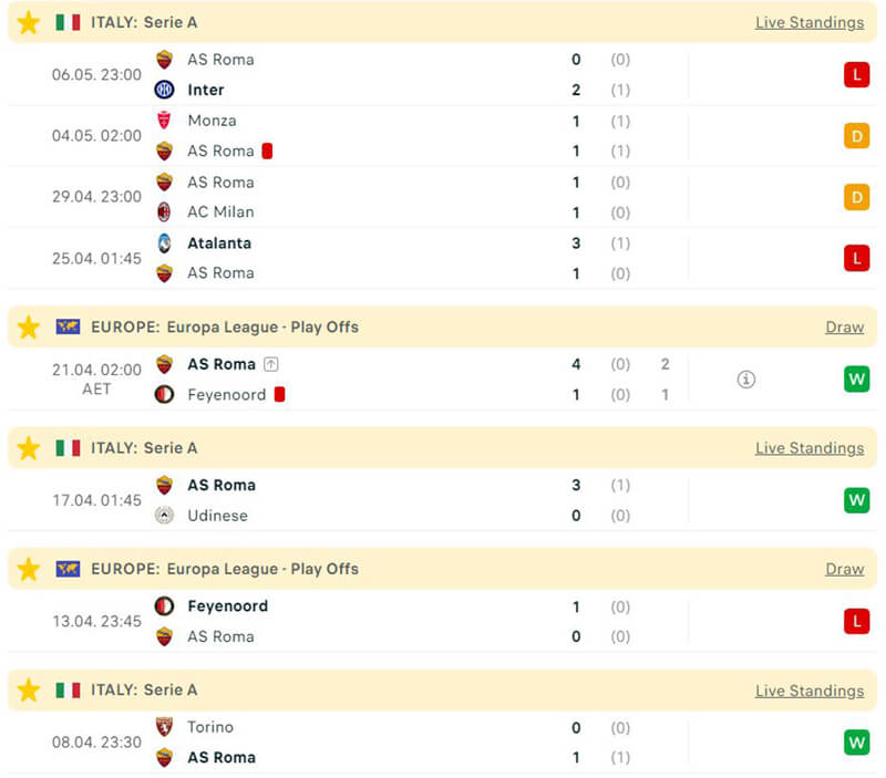 Phong độ thi đấu giữa AS Roma vs Bayer Leverkusen
