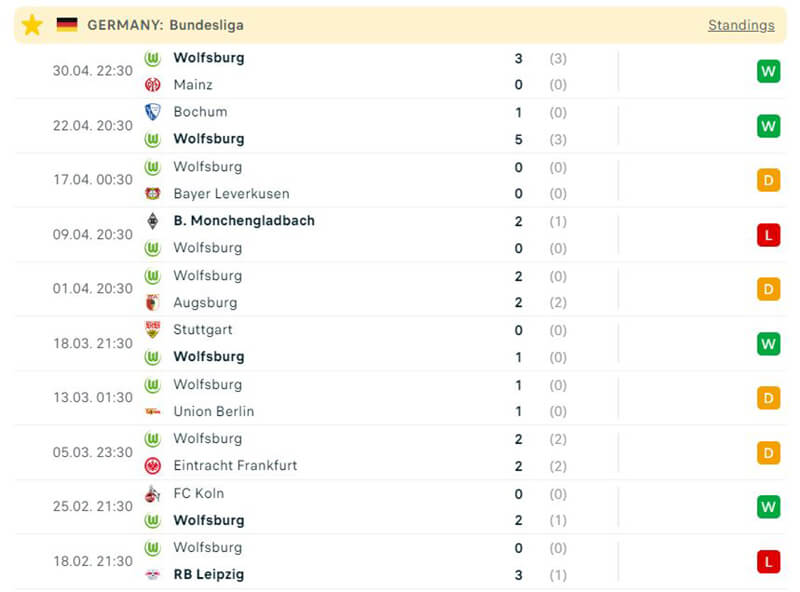 Phong độ thi đấu giữa Dortmund vs Wolfsburg