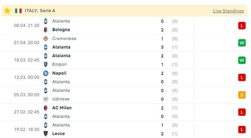 Trái lại hoàn toàn, đội khách Atalanta đang có phong độ sa sút khi ở 10 trận đấu gần đây nhất đội bóng này mới chỉ có 3 chiến thắng và phải nhận tới 6 thất bại.
