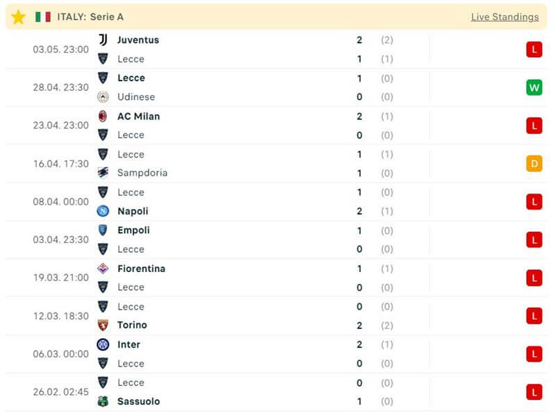Lecce đang gặp khủng hoảng và rơi tự do trên bảng xếp hạng. Hàng thủ của đội bóng này chơi khá ổn so với những đội top dưới khi để lọt lưới 40 lần. Tuy nhiên, hàng công của đội bóng này đang gặp rất nhiều vấn đề khi mới chỉ có được 4 lần nổ súng sau 10 trận đấu gần đây nhất.