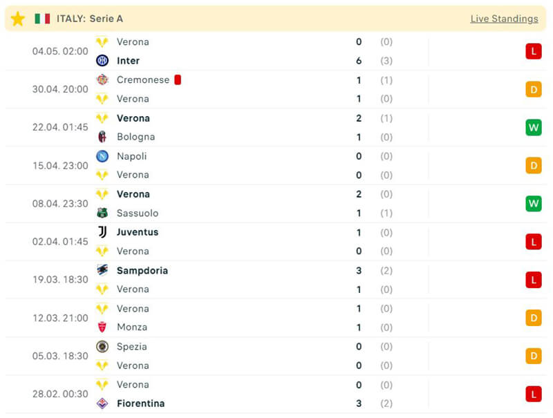 Phong độ thi đấu giữa Lecce vs Verona