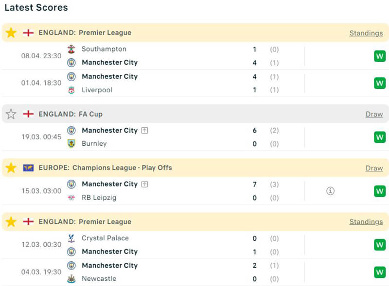 Phong độ thi đấu giữa Manchester City vs Leicester City