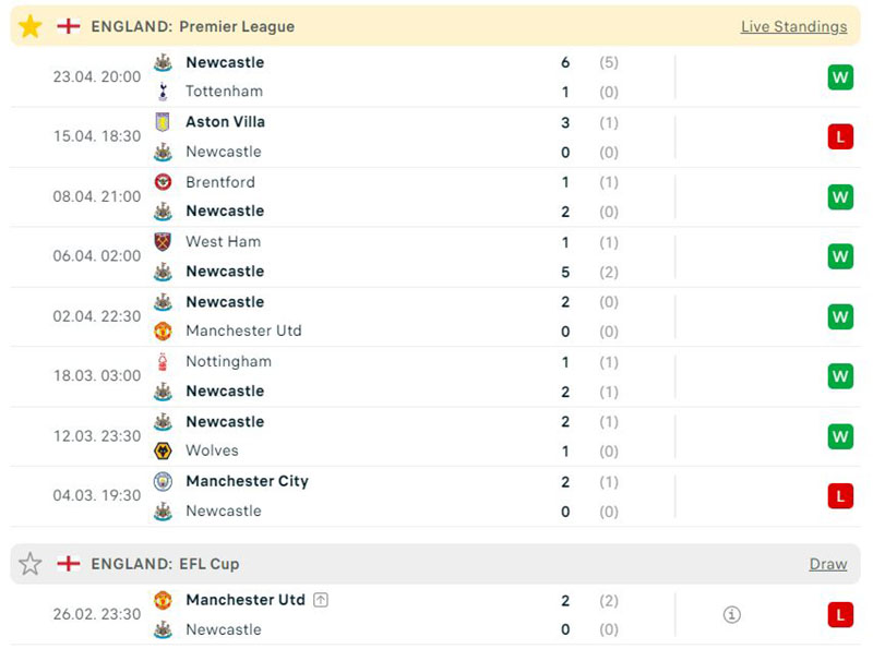 Thống kê 5 trận đối đầu gần đây nhất của 2 đội thì Newcastle áp đảo tuyệt đối với 4 chiến thắng và 1 trận hoà.