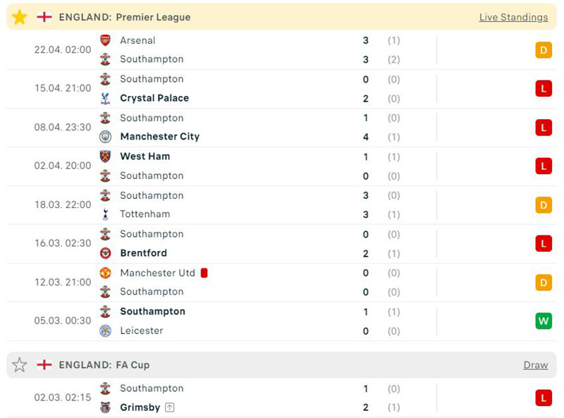 Trong khi đó Southampton lại có 1 mùa giải tan nát khi qua 32 vòng đấu đội bóng này mới chỉ có được 6 chiến thắng và phải nhận 20 thất bại. Hàng công của Southampton cũng thi đấu rất thiếu sức sống khi cho đến thời điểm hiện tại họ mới chỉ có được 27 pha lập công.