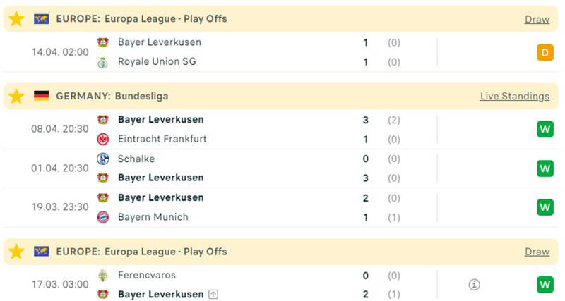 Thống kê 5 lần đối đầu gần đây nhất của 2 đội thì đội khách Bayer Leverkusen hoàn toàn áp đảo với 4 chiến thắng và 1 trận hoà.