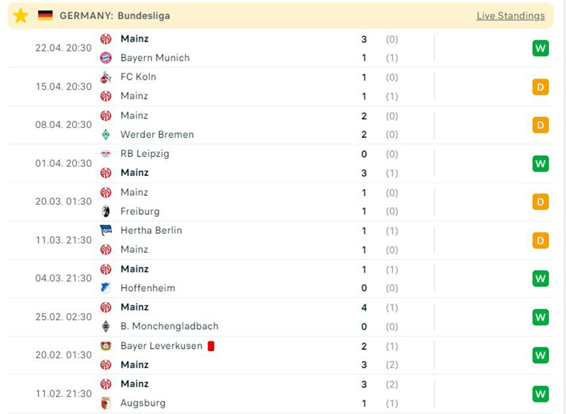 Trái lại hoàn toàn, đội khách Mainz lại đang có phong độ thi đấu rất suất xắc với chuỗi 10 trận bất bại, trong đó có 6 trận thắng trước Leverkusen, Leipzig và cả Bayern Munich.
